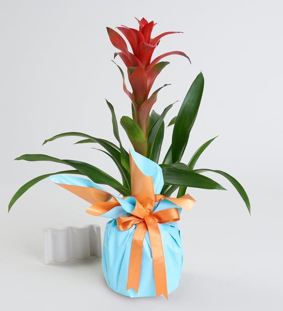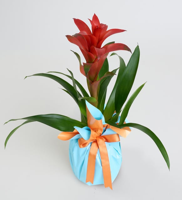 Turuncu Mavi Buket Kağıtlı Guzmania Aranjmanı
