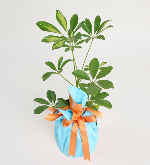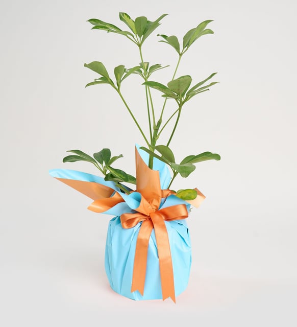 Schefflera’nın şemsiyevari yaprakları, turuncu ve mavinin canlı karşılaşmasıyla yumuşak bir denge kuruyor. Modern çizgilerle doğallığın buluştuğu bu düzenleme, ışıkla temas ettikçe iç mekanda ferah bir akış hissi uyandırır. Turuncu kurdele ve jüt dokunuşları, tasarımın enerjisini zarafetle yavaşlatır; ritmi sakin, etkisi güçlü bir kompozisyon.