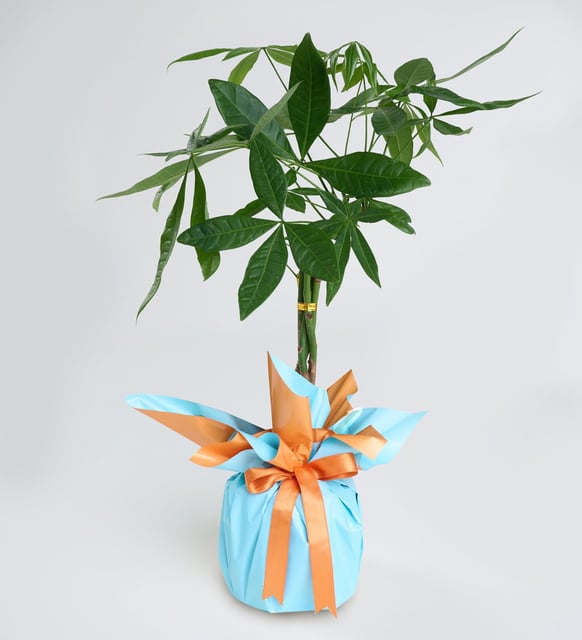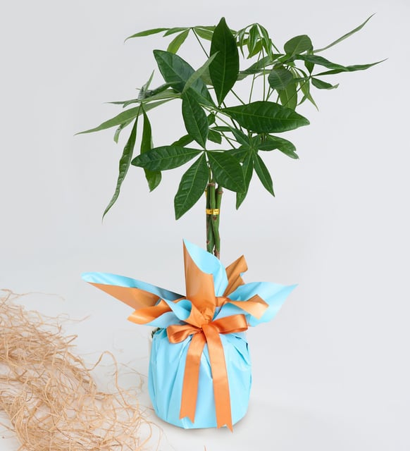 Turuncu Mavi Buket Kağıtlı Pachira (Para Bitkisi)