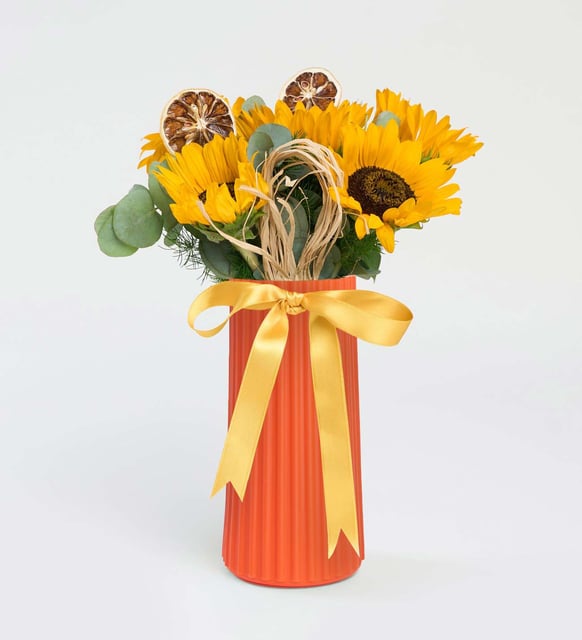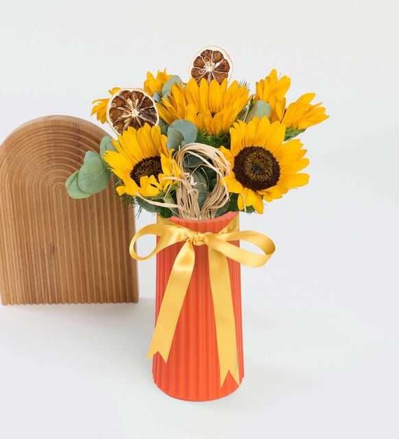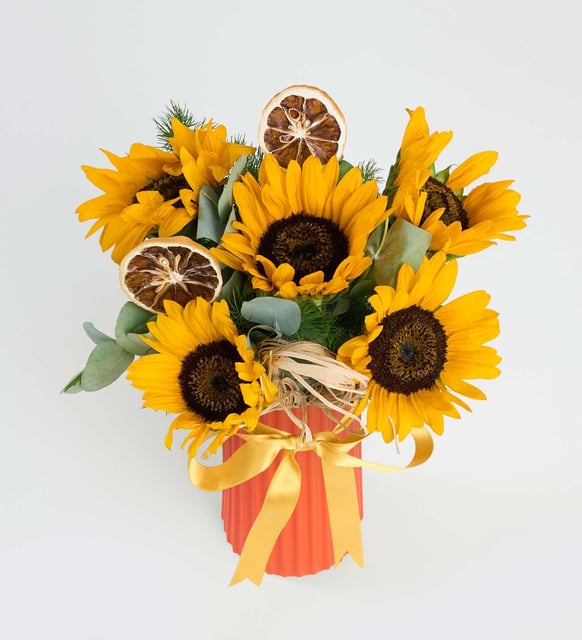Güneşin içten bir tebessümü gibi, beş ayçiçeği turuncu bir vazonun sıcak tonunda toplanıyor. Solidasterın narin sarıları ve virgetus yeşilliğinin sakin dokusu, rafyanın doğal hissiyle birlikte kurutulmuş limon dilimlerinin hafif Akdeniz esintisini taşıyor. Modern bir polimer vazo içinde, neşenin ölçülü ve zarif bir ifadesi; bulunduğu mekana canlılık katarken, gündelik anların üzerine yumuşak bir ışık düşürüyor.
