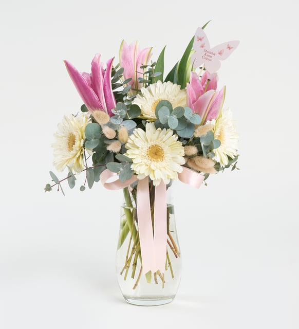 Güne nazikçe dokunan bir sabah gibi… İthal pembe lilyumlar, taze açan beyaz gerberaların dinginliğine yaslanır. Okaliptus dalları, ormandan taşıdığı serinliği fısıldarken bej lagurusun kadifemsi dokusu kompozisyona yumuşak bir ritim ekler. Açık pembe kurdele, tüm bu duyguları zarifçe bir araya getirir. İnce bir kelebek pankartı, söylenmek istenen küçük bir mesajı usulca taşır. Paşabahçe’nin kristal karakterli cam silindir vazosu ise ışığı sakinlikten yana seçerek bulunduğu ortama ferah bir denge katır.