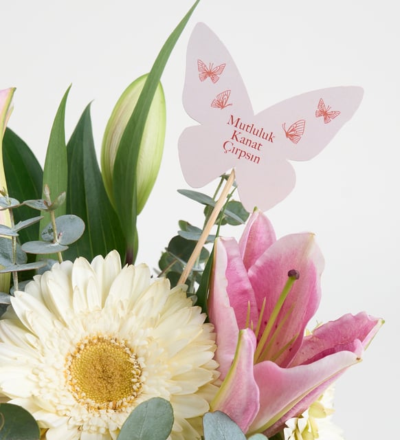 Vazoda Kelebekli Pembe Lilyum ve Beyaz Gerberalar