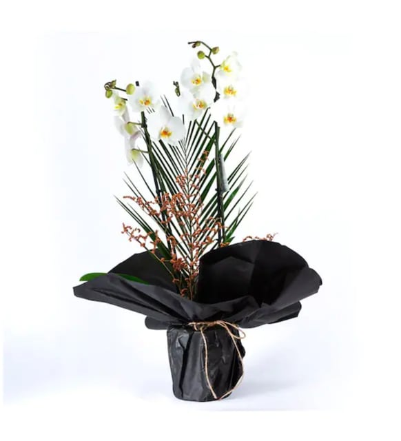 Mekanın ışığıyla yumuşak bir sohbet başlatan beyaz. İki zarif dalın üzerinde, her çiçek sessizce birbirine eşlik eder; süreklilik duygusu, dingin bir ritim ve zamansız bir zarafet taşır. Bu orkide, odanın sesini alçaltır ve bakışları bir noktada toplar; yalınlığın içindeki incelikle.