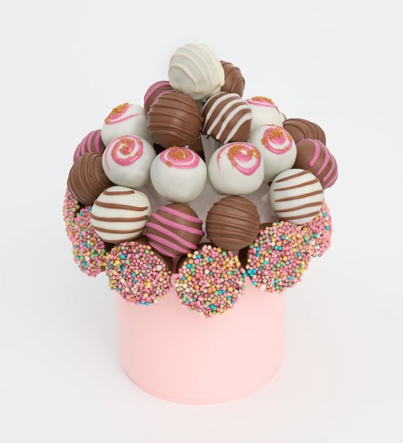 Siyah kakaonun koyu tınısı, ince granül şekerin kristalimsi parıltısıyla buluşuyor. Bir akşam ritüeli gibi, yumuşak dokulu silindir keklerin yanında sütlü konfiserinin zarif örtüsüyle tamamlanan trüfler; tatlılığın sakin, dengeli bir yorumunu fısıldar. Yanında yer alan kırmızı yapay gül, anınızı zamana sabitleyen, uzun süre hatırlanacak bir duruş sergiler.