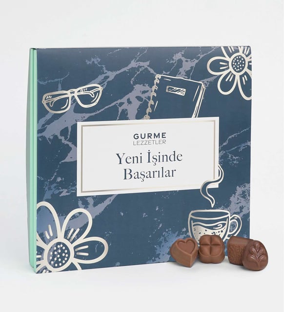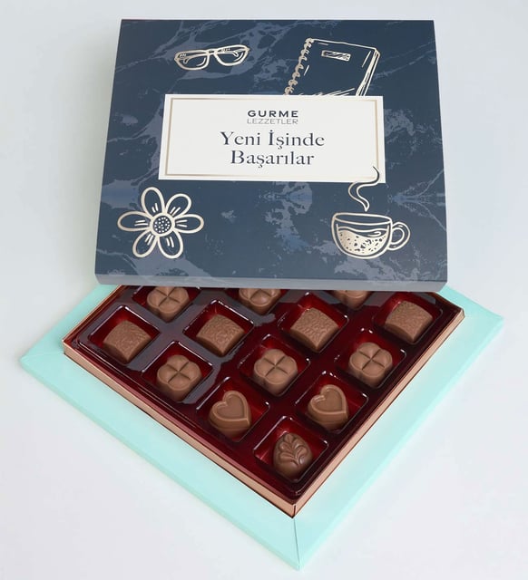 Yeni bir başlangıcın sessiz sevincini taşıyan küçük bir kutu. Kapağı açıldığında yayılan sütlü çikolata kokusu, günün temposuna yumuşak bir ritim ekler. Kare ve kalp formlarındaki kokolinlerin parlak yüzeyi, palmiye desenli çikolatanın hafif esintisiyle buluşur; çalışma masasında sakin, zarif bir ara yaratır. Kılıfta yer alan Yeni İşinde Başarılar ifadesi, yüksek sesli kutlamalardan çok, içten ve derin bir temenni gibi kalır.