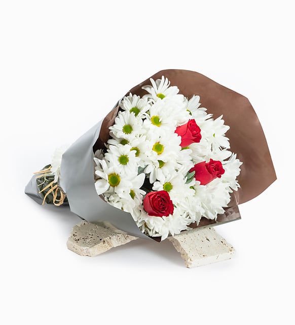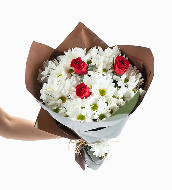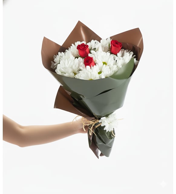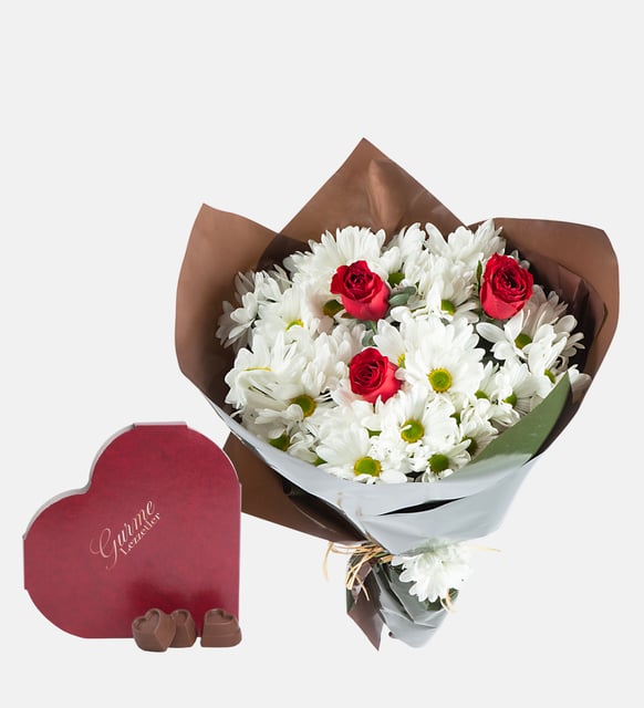 Kırmızının sıcak kalbi, beyazın sakin nefesiyle buluşuyor; yeşil ve kahvenin doğal dokusu her şeyi yumuşatıyor. Bu buket, gündelik bir ana bile huzurlu bir ritim kazandıran o sessiz uyumu taşıyor. Okaliptüsün ferah esintisi, güllerin derin tonu ve papatyaların dingin ışığı… Bir masanın üzerinde, bir kapının eşiğinde veya iki cümle arasındaki durakta; aynı sade zarafet.