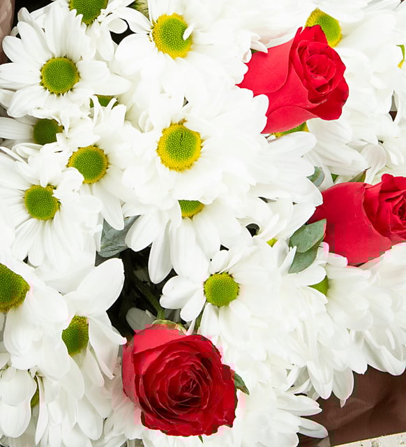Yeşil Kahve Bukette Kırmızı Güller ve Papatyalar