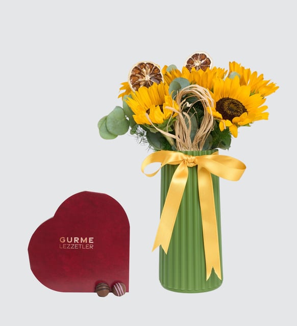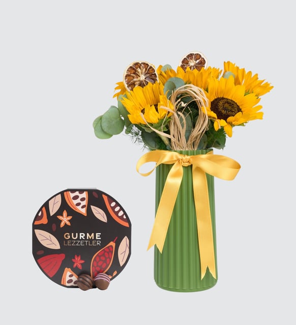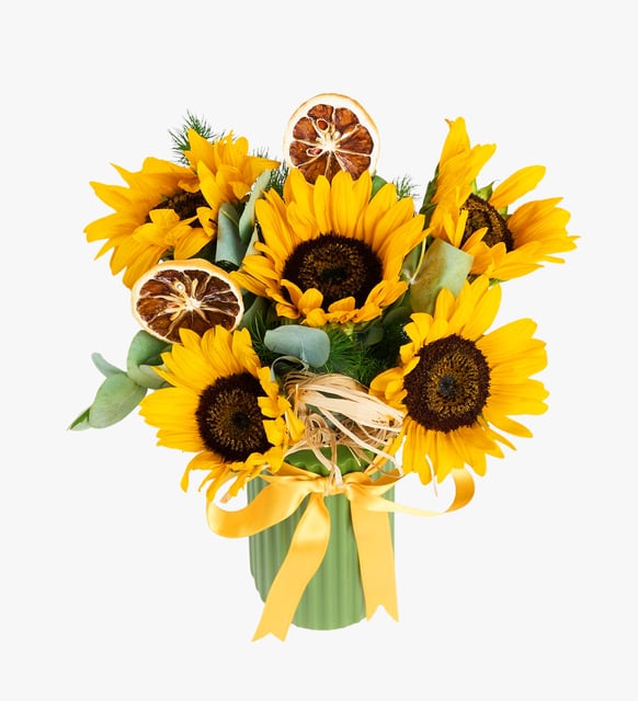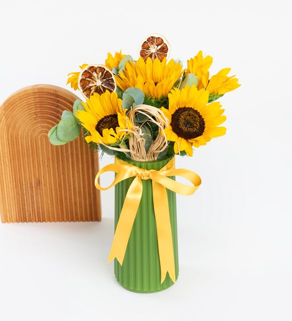 Beş ayçiçeğinin sıcak öğle ışığını andıran parlaklığı, zeytin tonunda bir polimer vazonun içinde dingin bir yaz gününü çağrıştırıyor. Kurutulmuş limonun hafif narenciye vurgusu, rafyanın doğal dokusu ve virgetus yeşilliğinin kırsal ferahlığı; solidasterin ince altın tınılarıyla buluşurken, zeytin yeşili kurdele kompozisyona sakin bir ritim ekliyor. Neşeyi yüksek sesle söylemeden, yaşam alanına aydınlık ve iyi hisler taşıyan zarif bir duruş.